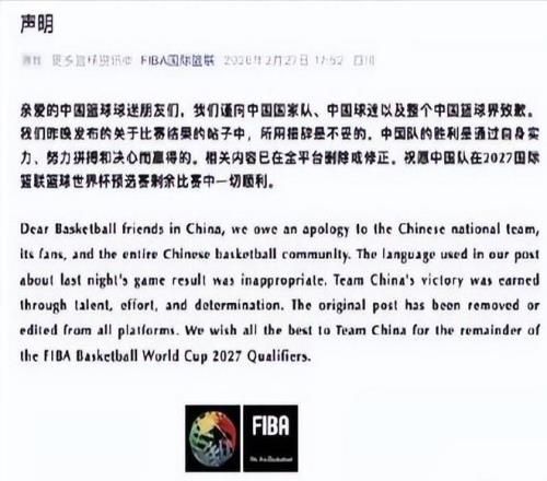 迫于洶涌輿情,國(guó)際籃聯(lián)于當(dāng)晚悄悄將原文中“sneaky”替換為中性詞“narrow”,但未配發(fā)任何說明。這種回避式處理非但未能平息眾怒,反而加劇公眾對(duì)其公信力的質(zhì)疑。2月27日清晨,國(guó)際籃聯(lián)火速發(fā)布中英文雙語(yǔ)致歉聲明。